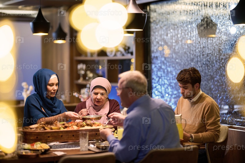 Современная и традиционная европейская исламская семья собирается вместе на ифтар в современном ресторане во время поста Рамадан, воплощая культурную гармонию и семейное единство на фоне кулинарного праздника разнообразия