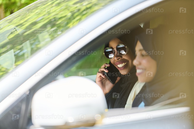 Две мусульманки в хиджабах разговаривают по смартфону, путешествуя вместе в машине по