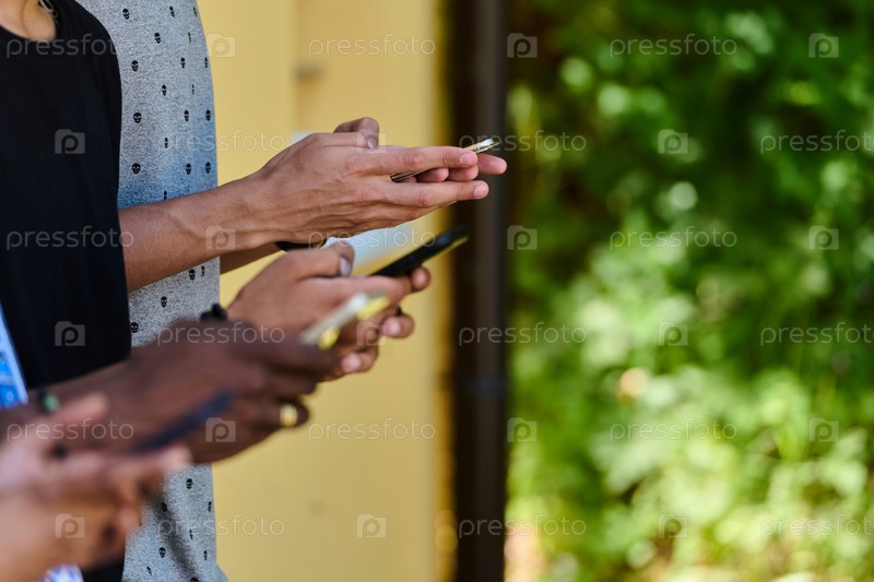 Группа подростков, стоящих вместе у стены, держащих в руках смартфоны