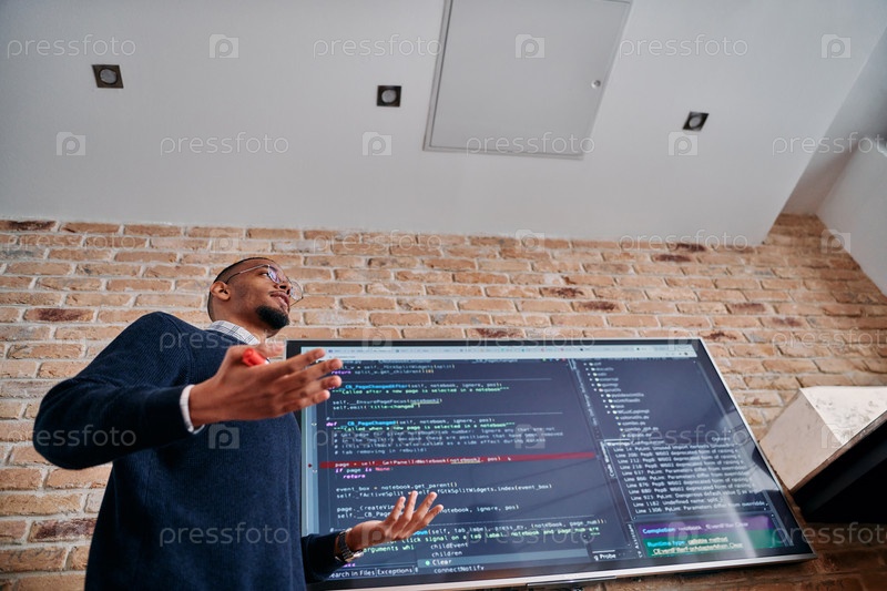 Афроамериканский бизнесмен проводит убедительную презентацию своей бизнес-стратегии для коллег, способствуя сотрудничеству и дальновидному мышлению