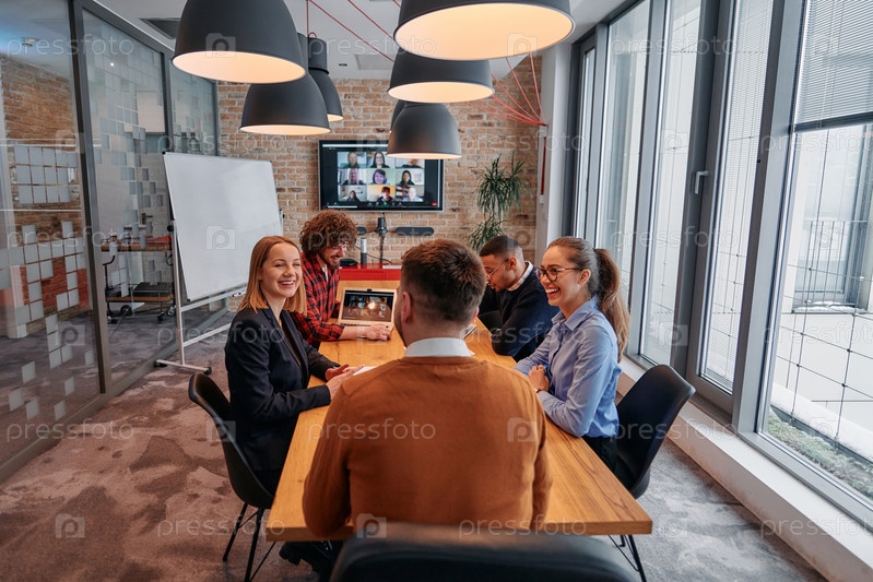 В яркой атмосфере современного офиса стартапа разнообразная команда профессионалов в сфере бизнеса участвует в обсуждениях различных проектов и разрабатывает новые бизнес-стратегии, олицетворяя креативность и инновации в предпринимательской среде