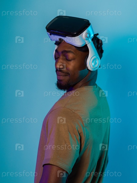 В футуристическом визуальном образе афроамериканец стоит в одиночестве на ярком синем фоне, украшенный очками виртуальной реальности, которые переносят его в передовой опыт виртуальной реальности, объединяющий технологии и инновации в современном представ