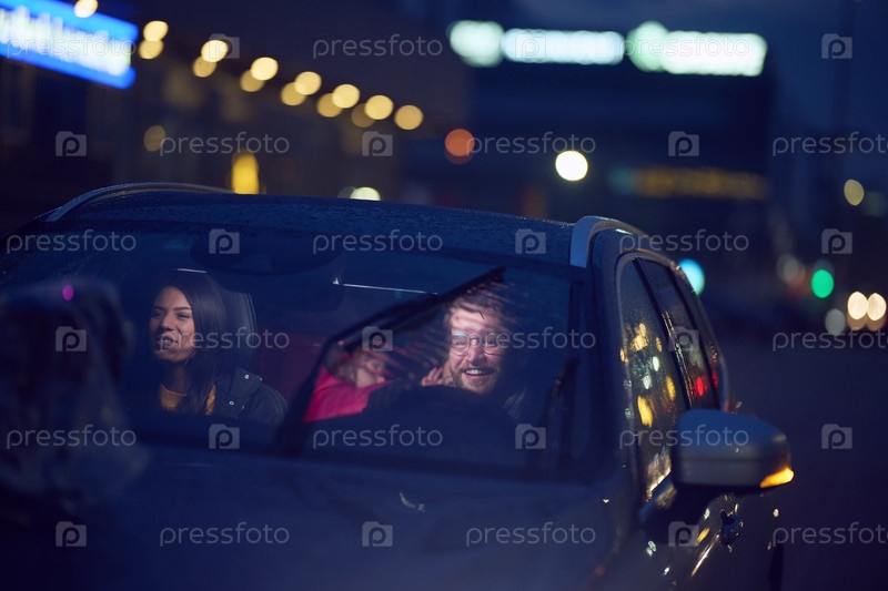 В ночные часы счастливая семья наслаждается игровыми моментами вместе в машине, путешествуя по ночной дороге, освещенной светом фар и наполненной смехом и радостью
