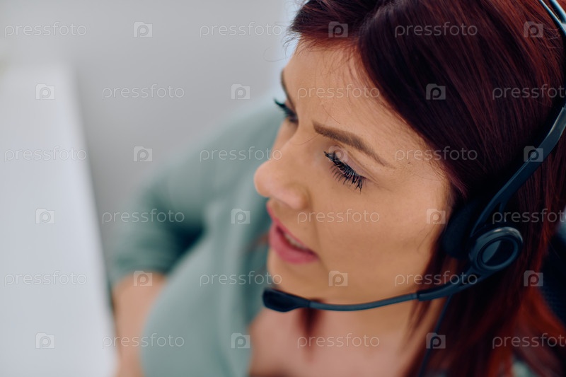 Дружелюбный агент колл-центра отвечает на входящие звонки с помощью гарнитуры и обеспечивает удаленное обслуживание клиентов