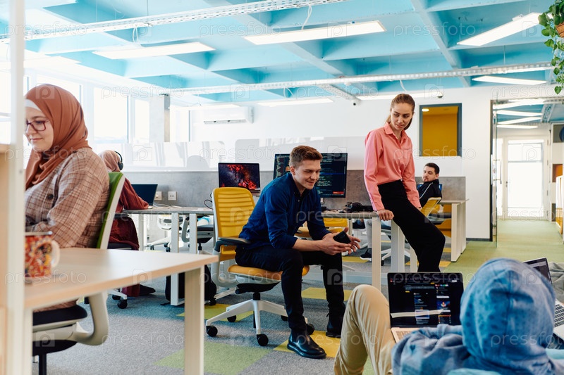 В современном офисе стартапа разнообразная группа молодых и способных бизнесменов ведет оживленные обсуждения различных проектов, демонстрируя командную работу, инновации и предпринимательский дух
