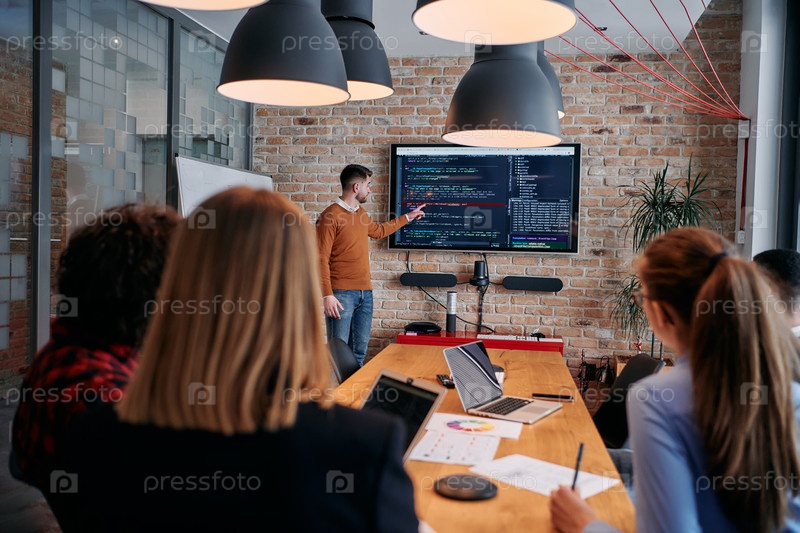 В корпоративной обстановке бизнесмен проводит совещание, страстно представляя бизнес-план своей внимательной команде, способствуя сотрудничеству и стратегическому мышлению