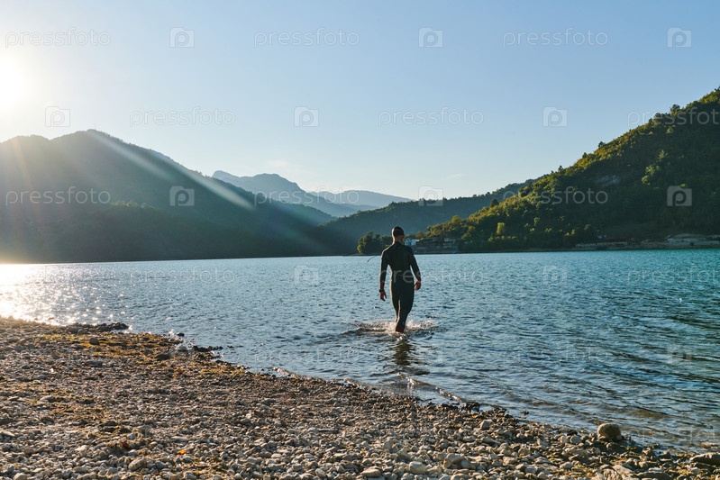 Спортсмен по триатлону начал тренировку по плаванию на озере