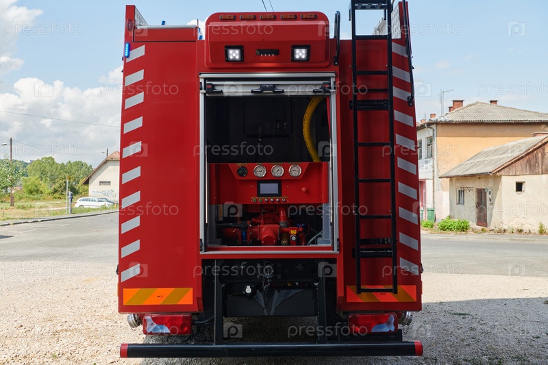 Современная пожарная машина, оснащенная передовыми спасательными технологиями, с опытной пожарной командой, готовой вмешаться и быстро отреагировать на чрезвычайные ситуации, обеспечивая безопасность и защиту общества