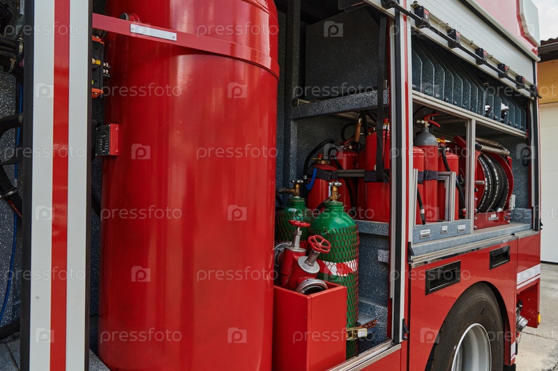 Современная пожарная машина, оснащенная передовыми спасательными технологиями, с опытной пожарной командой, готовой вмешаться и быстро отреагировать на чрезвычайные ситуации, обеспечивая безопасность и защиту общества