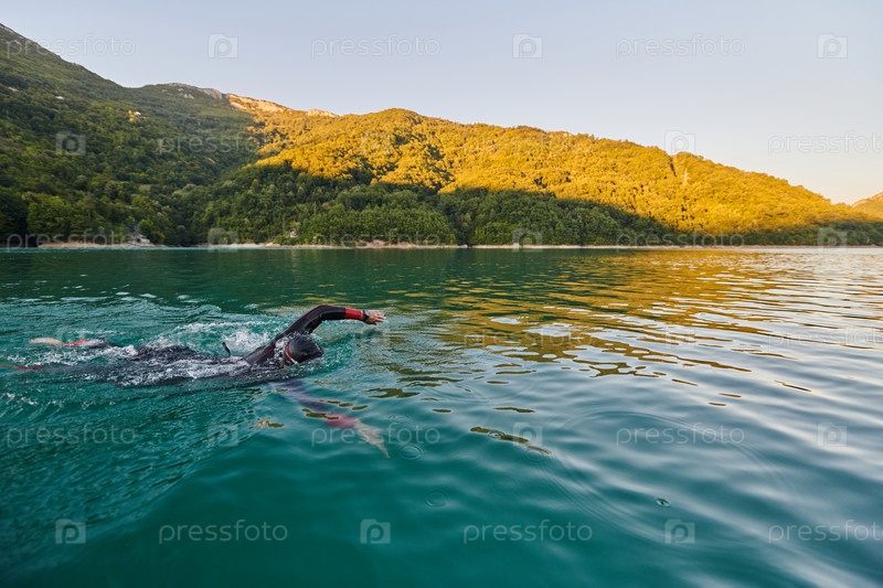 Триатлонист плывет по озеру на рассвете в гидрокостюме