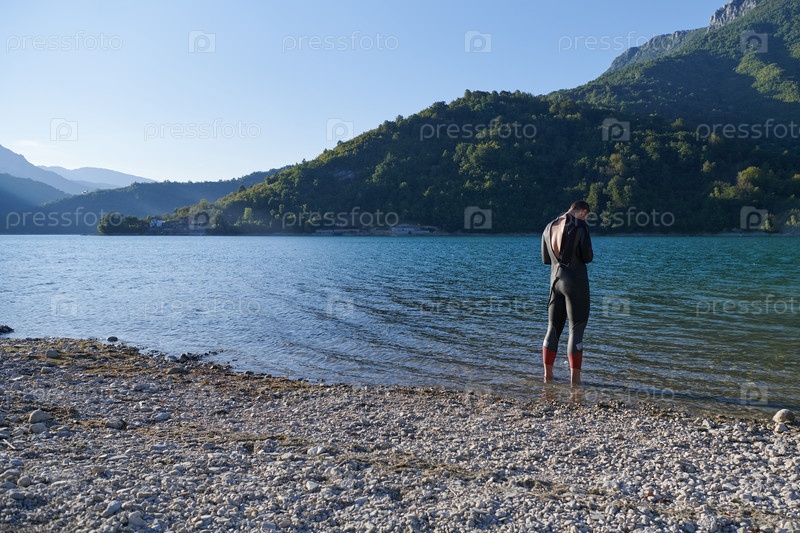 Настоящий триатлонист готовится к тренировке по плаванию на озере