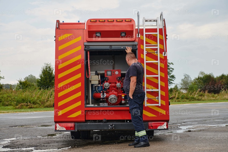 Современная пожарная машина, оснащенная передовыми спасательными технологиями, с опытной пожарной командой, готовой вмешаться и быстро отреагировать на чрезвычайные ситуации, обеспечивая безопасность и защиту общества