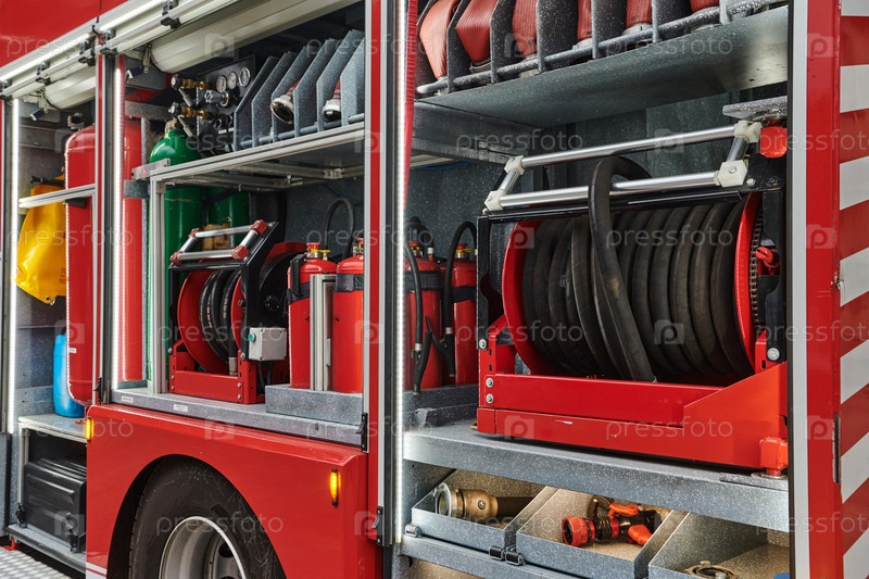Современная пожарная машина, оснащенная передовыми спасательными технологиями, с опытной пожарной командой, готовой вмешаться и быстро отреагировать на чрезвычайные ситуации, обеспечивая безопасность и защиту общества