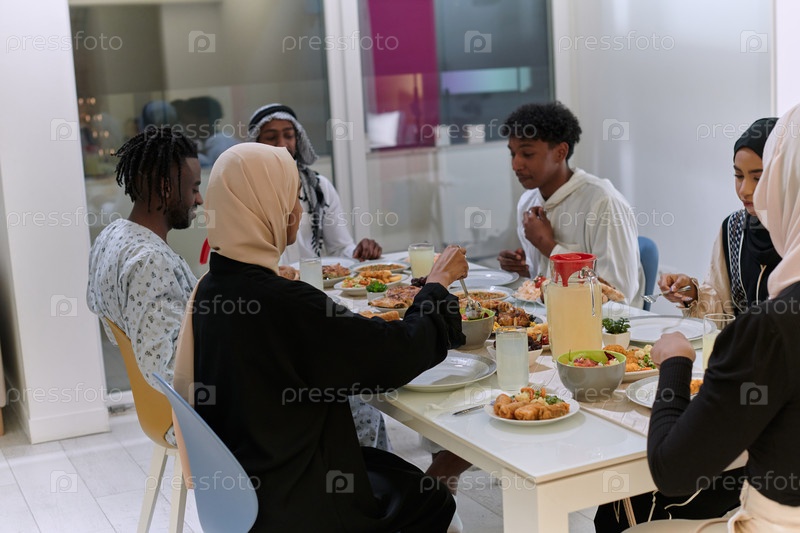 Традиционная и разнообразная мусульманская семья собирается вместе, чтобы разделить вкусную трапезу ифтар во время священного месяца Рамадан, воплощая суть семейной радости, культурного богатства и духовного единства в их общем праздновании