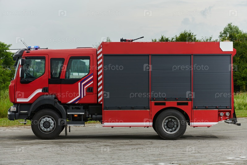 В этой захватывающей сцене современная пожарная машина, оснащенная передовыми спасательными технологиями, стоит наготове вместе со своей опытной пожарной командой, готовой вмешаться и быстро отреагировать на чрезвычайные ситуации, обеспечивая безопасность