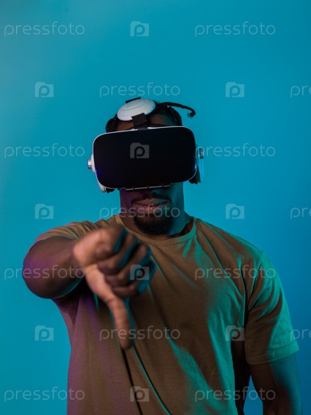 Афроамериканец в очках виртуальной реальности выражает недовольство, указывая рукой вниз, стоя в изоляции на синем фоне, изображая современную критику в захватывающем цифровом мире