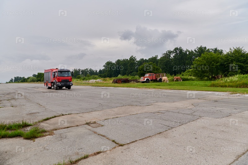 В этой захватывающей сцене современная пожарная машина, оснащенная передовыми спасательными технологиями, стоит наготове вместе со своей опытной пожарной командой, готовой вмешаться и быстро отреагировать на чрезвычайные ситуации, обеспечивая безопасность