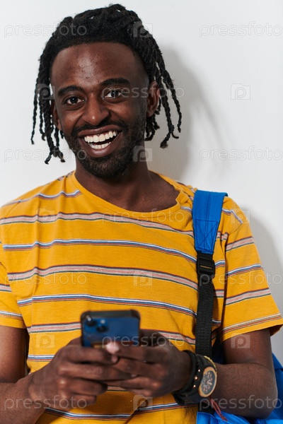 Афроамериканский подросток использует свой смартфон на чистом белом фоне, воплощая суть современной цифровой связи и молодежной культуры