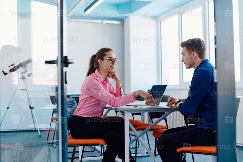 В элегантном современном стеклянном офисе директор ведет продуктивную беседу с сотрудником, уделяя особое внимание бизнес-проектам и налаживанию сотрудничества