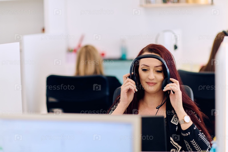 Дружелюбный агент колл-центра отвечает на входящие звонки с помощью гарнитуры, обеспечивая удаленное обслуживание клиентов