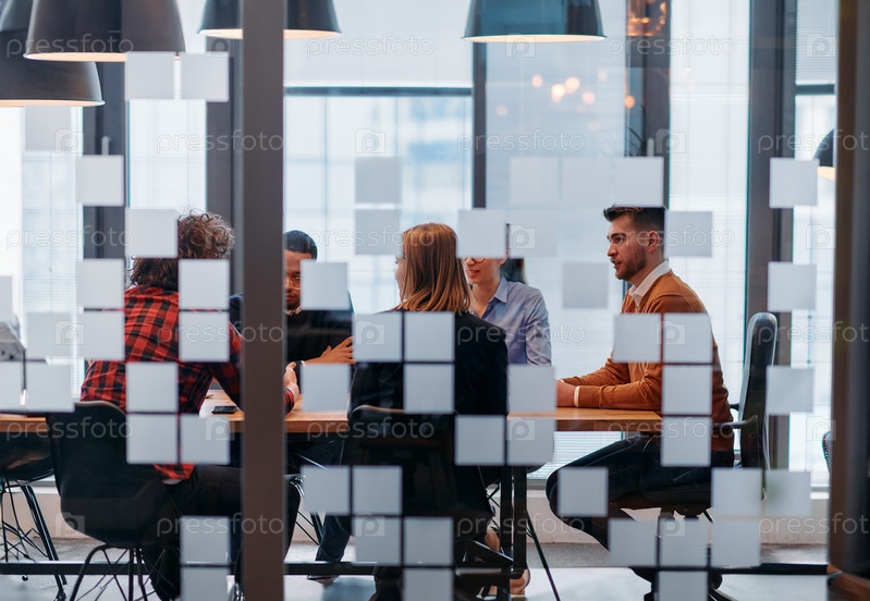 В элегантном стеклянном офисном помещении команда профессионалов бизнеса ведет оживленные дискуссии и обменивается стратегическими идеями, демонстрируя сотрудничество и инновации, лежащие в основе современной корпоративной культуры