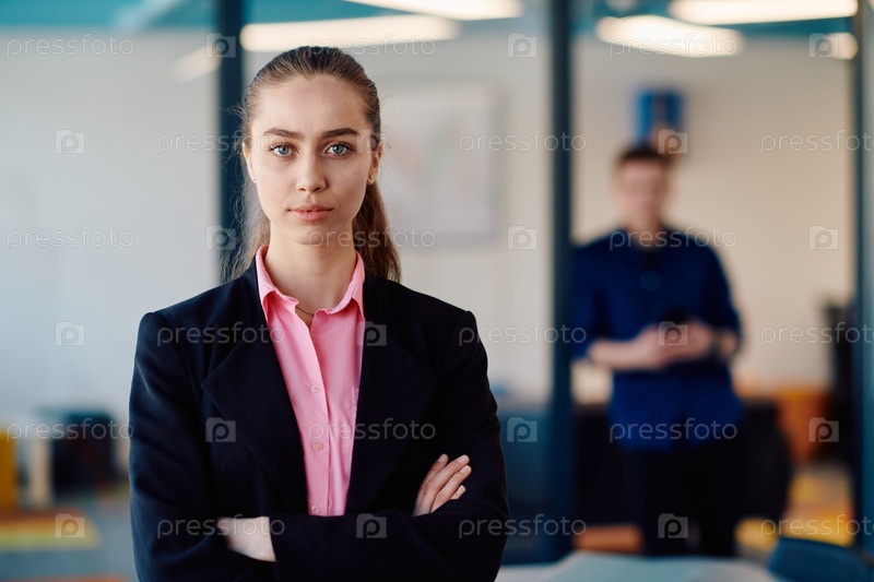 Портрет деловой женщины в креативном открытом пространстве коворкинга стартап-офиса со скрещенными руками. Успешная бизнес-леди стоит в офисе с копирайтом. На заднем плане работают коллеги