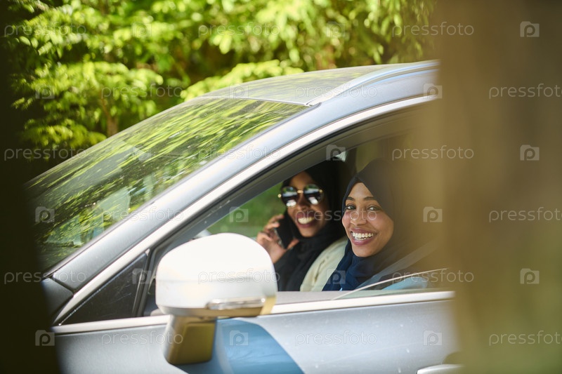 Две мусульманки в хиджабах разговаривают по смартфону, путешествуя вместе в машине по