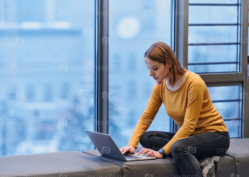 Деловая женщина пользуется ноутбуком, сидя у окна большого корпоративного здания, на фоне которого открывается живописный вид на городской пейзаж