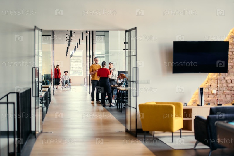 Разнообразная группа молодых специалистов, включая деловых женщин и афроамериканского предпринимателя в инвалидной коляске, совместно обсуждают различные бизнес-проекты в обстановке современного офиса стартапа