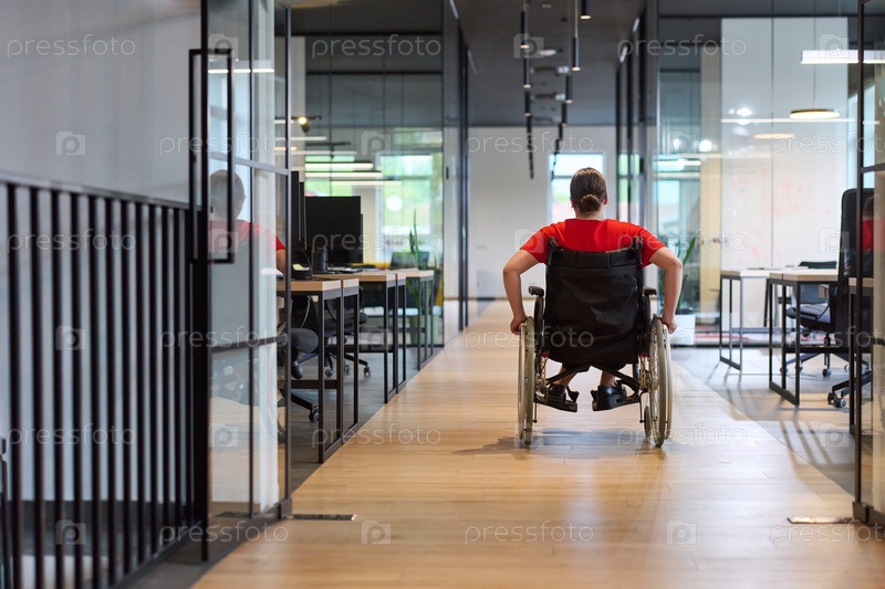 Современная молодая бизнес-леди в инвалидной коляске окружена инклюзивным рабочим пространством с офисами со стеклянными стенами, олицетворяющими решимость и инновации в деловом мире