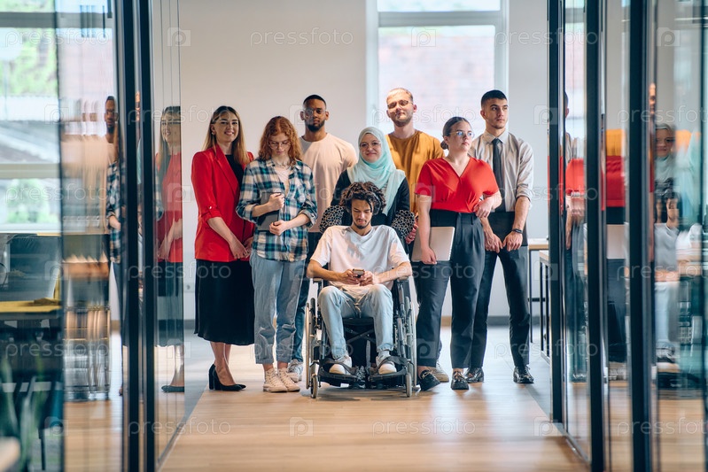 Разнообразная группа молодых бизнесменов собирается в современном офисе стартапа со стеклянным ограждением, демонстрируя инклюзивность: среди них есть человек в инвалидной коляске, афроамериканский молодой человек и мусульманка в хиджабе