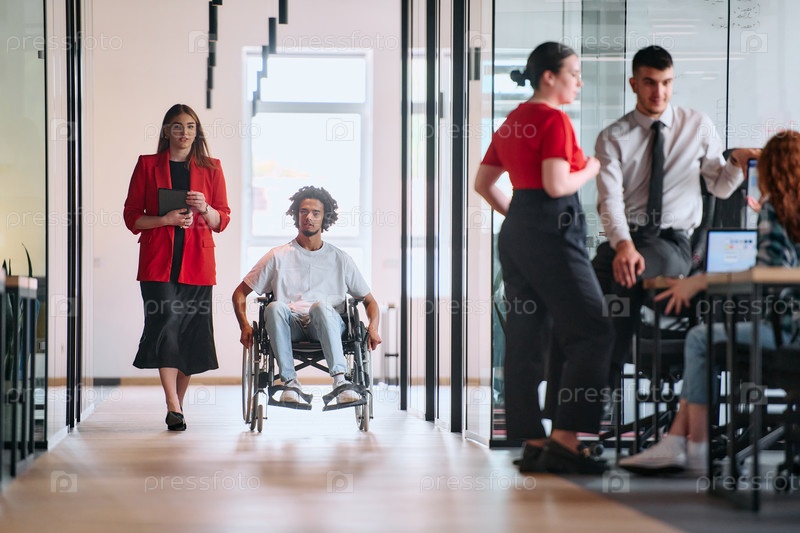 Руководитель бизнеса со своим коллегой, афроамериканским бизнесменом, который является инвалидом, проходят мимо своих коллег, работающих в современных офисах