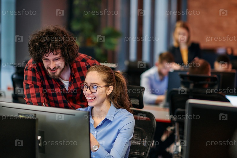 Коллеги по бизнесу, мужчина и женщина, обсуждают бизнес-стратегии, внимательно глядя на монитор компьютера, олицетворяя сотрудничество и инновации