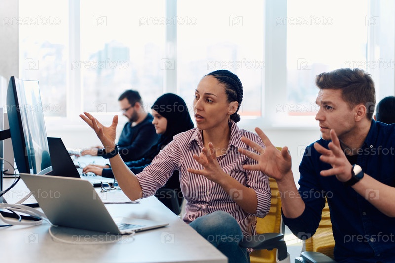 Совместный процесс многонациональной квалифицированной молодой бизнес-команды во время мозгового штурма в офисе. Разнообразная группа молодых людей, одетых в официальную одежду, сотрудничает в разработке дизайн-проекта