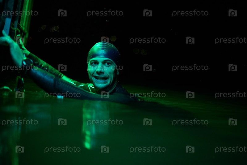 Настоящий пловец-триатлонист отдыхает во время интенсивной тренировки под ночным неоновым гелем
