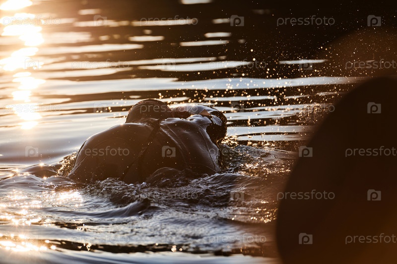 Триатлонист плывет по озеру на рассвете в гидрокостюме