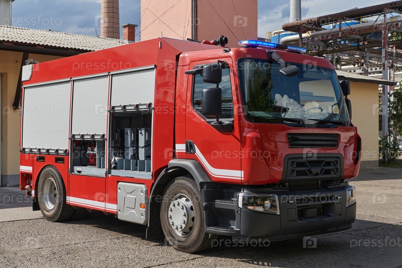 Современная пожарная машина, оснащенная передовыми спасательными технологиями, с опытной пожарной командой, готовой вмешаться и быстро отреагировать на чрезвычайные ситуации, обеспечивая безопасность и защиту общества