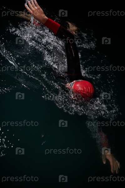 Целеустремленный профессиональный триатлонист проходит интенсивные ночные тренировки в холодной воде, демонстрируя самоотверженность и выносливость в рамках подготовки к предстоящим соревнованиям по триатлону