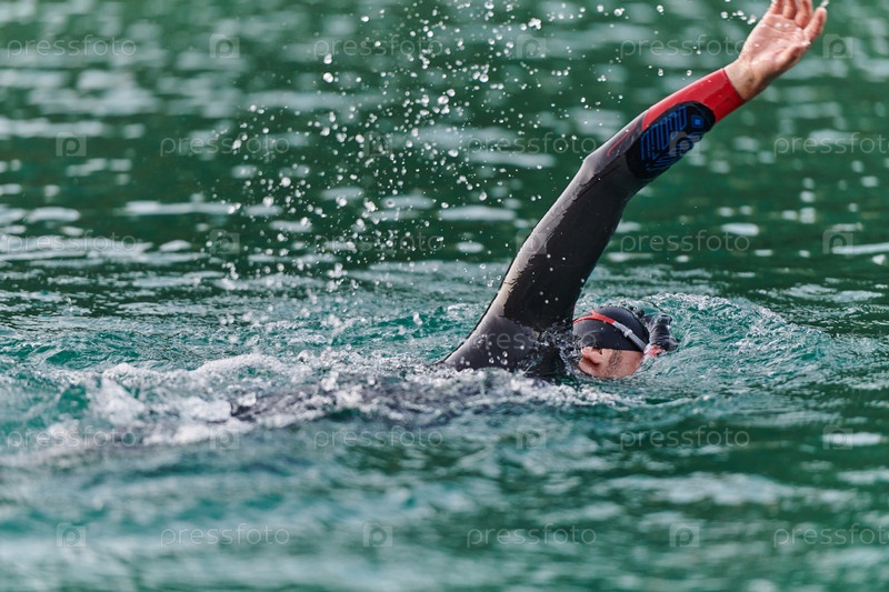 Профессиональный триатлонист с непоколебимой самоотдачей тренируется перед предстоящими соревнованиями на озере, излучая чувство атлетизма и глубокую приверженность совершенству