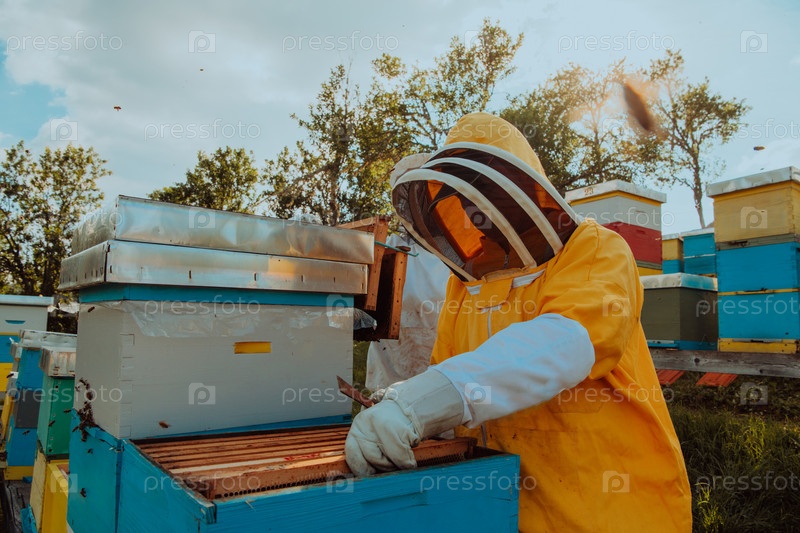 Пчеловод проверяет мед на рамке улья в поле. Владелец малого бизнеса на пасеке. Производитель натуральной здоровой пищи работает с пчелами и ульями на пасеке