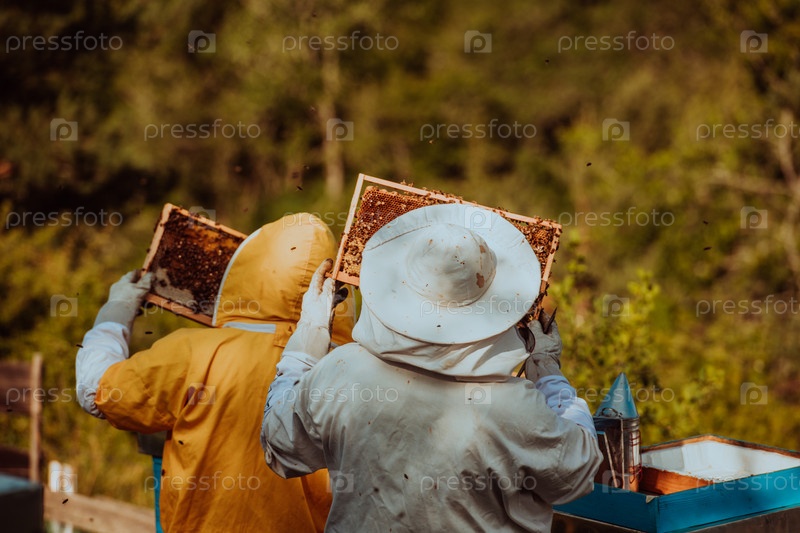 Пчеловоды проверяют мед на рамке улья в поле. Владельцы малого бизнеса на пасеке. Производитель натуральной здоровой пищи работает с пчелами и ульями на пасеке