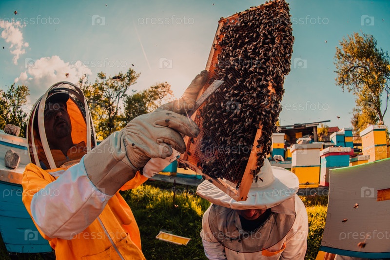 Пчеловоды проверяют мед на рамке улья в поле. Владельцы малого бизнеса на пасеке. Производитель натуральной здоровой пищи работает с пчелами и ульями на пасеке