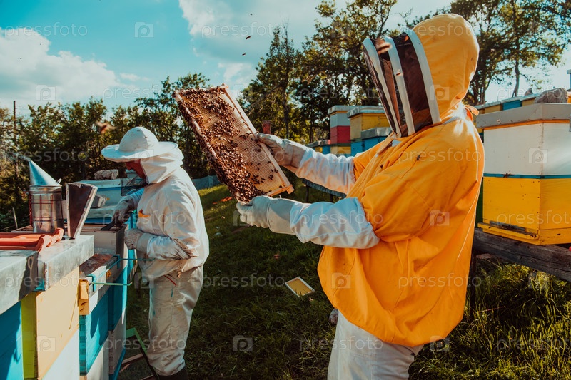 Пчеловоды проверяют мед на рамке улья в поле. Владельцы малого бизнеса на пасеке. Производитель натуральной здоровой пищи работает с пчелами и ульями на пасеке