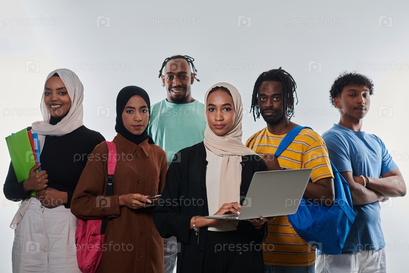 Группа разнообразных студентов занимается современными образовательными практиками, используя разнообразные технологические инструменты, такие как ноутбуки, планшеты и смартфоны, на чистом белом фоне, демонстрируя современный подход к совместному обучению