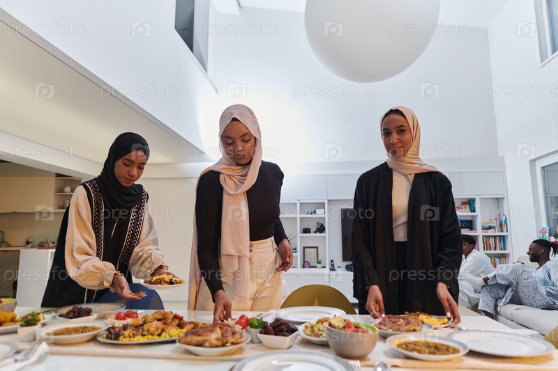Группа молодых арабских женщин собралась вместе, чтобы с любовью приготовить ифтар во время священного мусульманского месяца Рамадан, воплощая в своих кулинарных творениях суть общинного единства, культурных традиций и радостного предвкушения