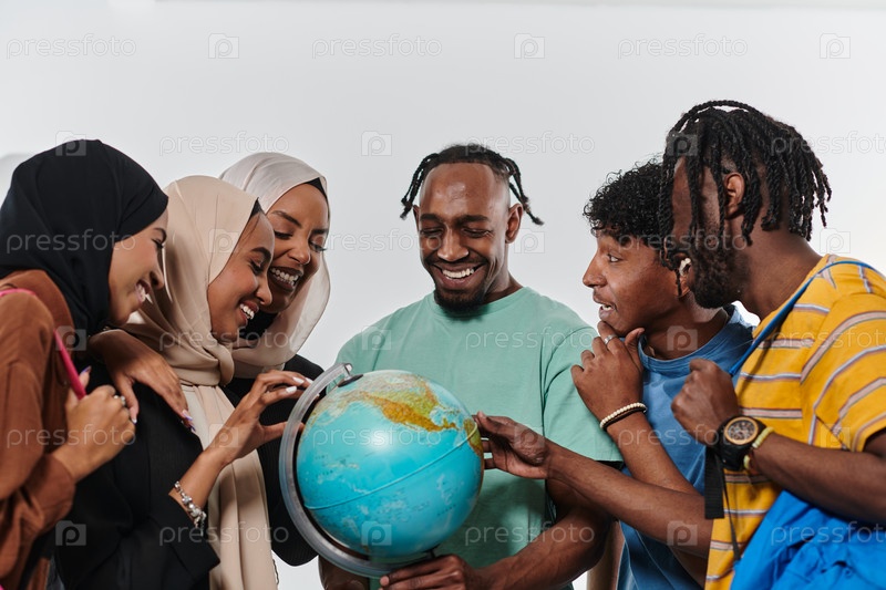 Разнообразная группа студентов собралась вокруг глобуса, поглощенная исследованием и учебой, их яркая энергия запечатлена на чистом белом фоне, символизирующем единство и любознательность в их образовательном путешествии