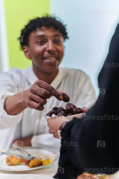 Афроамериканец-мусульманин деликатно берет финики, чтобы прервать пост во время месяца Рамадан, сидя за семейным обеденным столом, олицетворяя сцену духовного размышления, культурных традиций и общего ожидания общественного ифтара