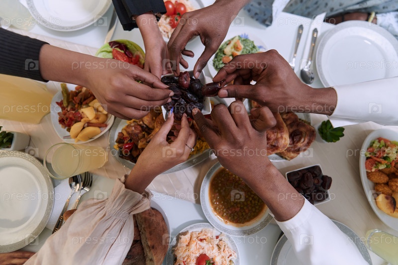 На трогательном крупном плане руки мусульманской семьи нежно сжимают свежие финики, символизируя завершение поста во время священного месяца Рамадан, запечатлевая момент культурного единства, общих традиций и радостного предвкушения общего ифтара