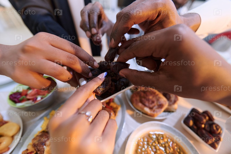 На трогательном крупном плане руки мусульманской семьи нежно сжимают свежие финики, символизируя завершение поста во время священного месяца Рамадан, запечатлевая момент культурного единства, общих традиций и радостного предвкушения общего ифтара