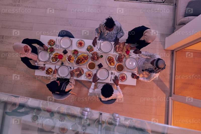 Вид сверху на мусульманскую семью, которая радостно собирается за столом, с нетерпением ожидая общего ифтара, занимаясь приготовлением общей трапезы и объединяясь в предвкушении коллективной молитвы, олицетворяя дух единения, преданности и культурного пра